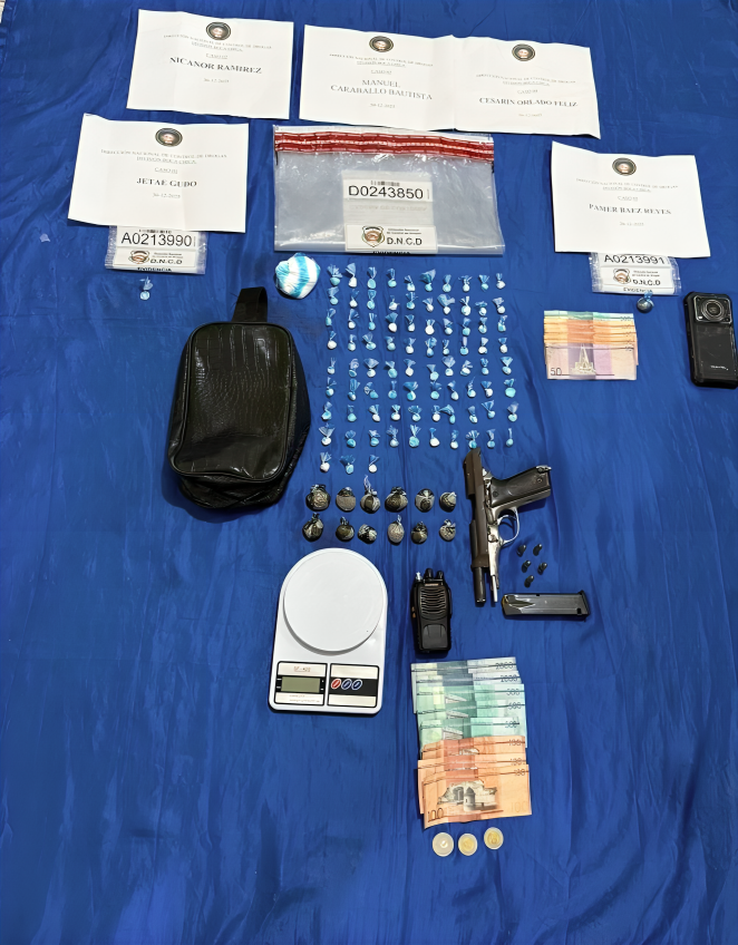 Durante la intervención, los agentes incautaron 85 porciones de presunta cocaína, 13 de presunta marihuana, una pistola calibre 9mm, una balanza, un radio de comunicación, dinero en efectivo y un teléfono celular.