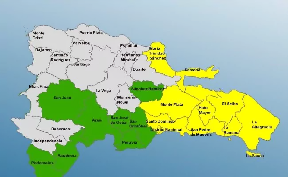 En alerta amarilla se encuentran: Santo Domingo (incluyendo el Distrito Nacional), María Trinidad Sánchez, La Romana, San Pedro de Macorís, La Altagracia, El Seibo, Samaná, Hato Mayor y Monte Plata.