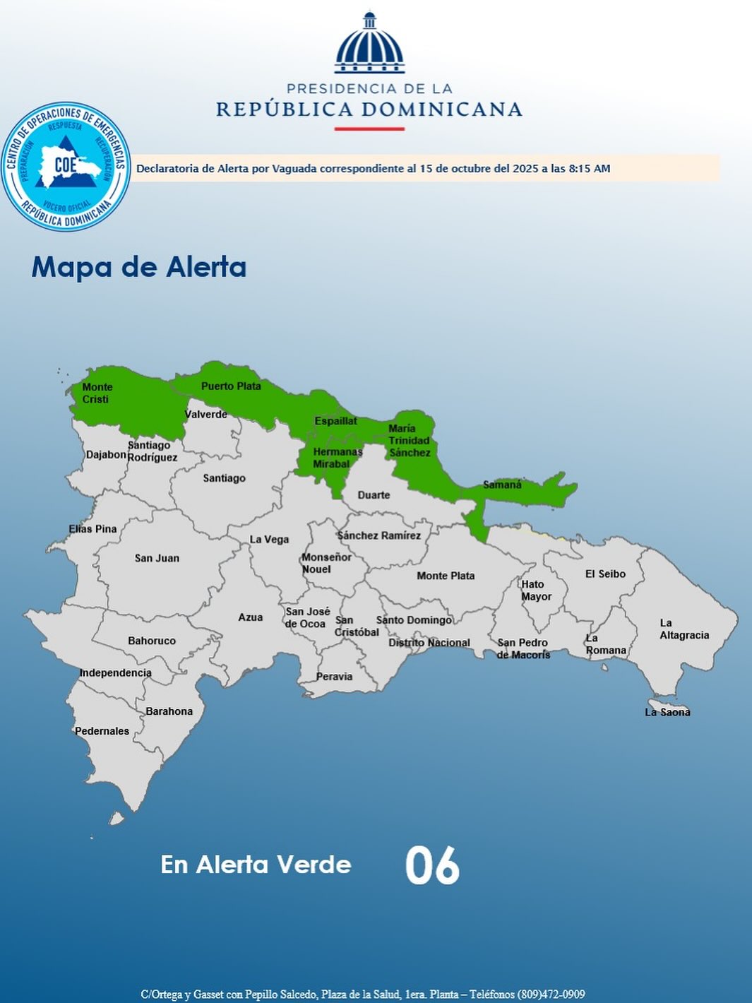 Las provincias en alerta verde son Montecristi, Samaná, Puerto Plata, Espaillat, Hermanas Mirabal y María Trinidad Sánchez.