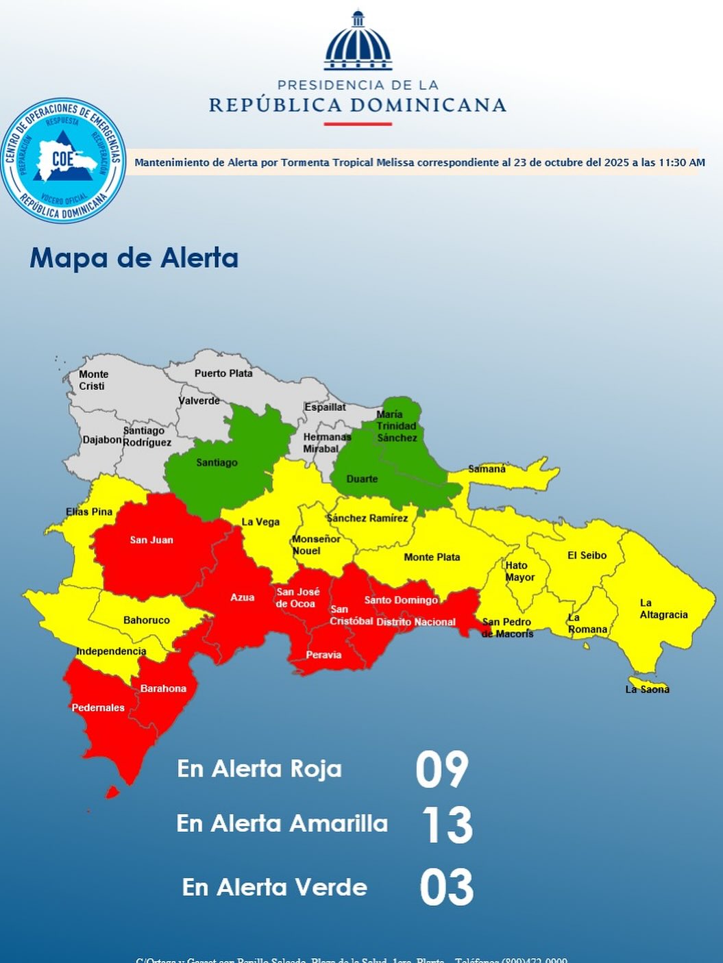 El Centro de Operaciones de Emergencias (COE) mantiene 9 provincias en alerta roja, 13 en amarilla y 3 en verde debido a los efectos de la tormenta tropical Melissa, ubicada aproximadamente a 450 kilómetros al suroeste de Puerto Príncipe (Haití) y a 355 kilómetros de Kingston (Jamaica).