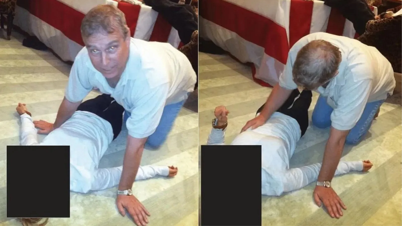 En una de las fotografías, el duque de York mira directamente a la cámara; en la otra, aparece con una mano apoyada sobre el abdomen de la mujer, quien permanece inmóvil. En el fondo se observa a otra persona con los pies sobre una mesa, en un entorno que aparenta ser distendido.
