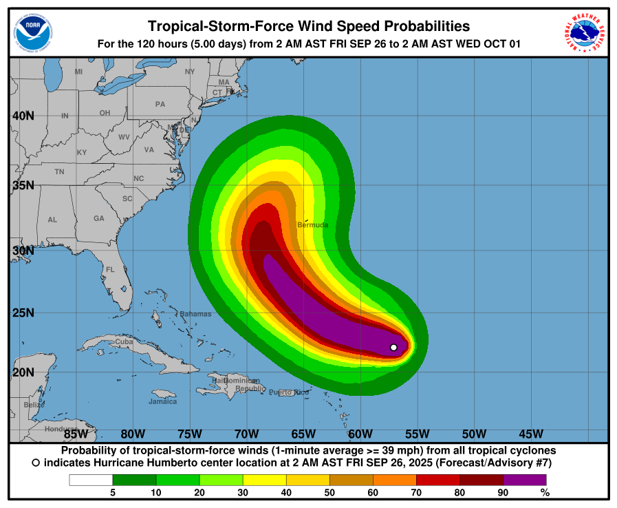 El NHC, con sede en Miami, informó que no hay vigilancias ni avisos costeros vigentes, dado que Humberto no representa un peligro inmediato para tierra firme.