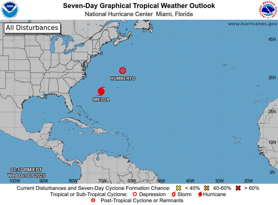 El huracán Imelda avanza este miércoles hacia Bermudas, mientras que Humberto, degradado a categoría 1, continúa generando fuerte oleaje y corrientes de resaca en la costa este de Estados Unidos, según informó el Centro Nacional de Huracanes (NHC).