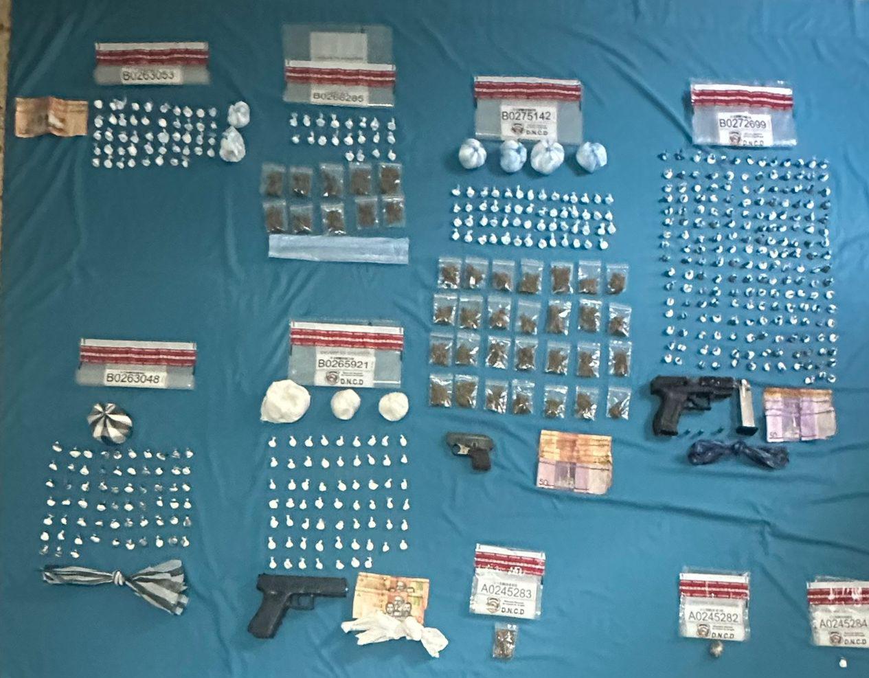 Asimismo, incautaron tres pistolas con sus cargadores y varias cápsulas, dos balanzas, cuatro celulares, fundas, tijeras, dinero en efectivo y otras evidencias vinculadas con el tráfico y la venta de sustancias controladas.