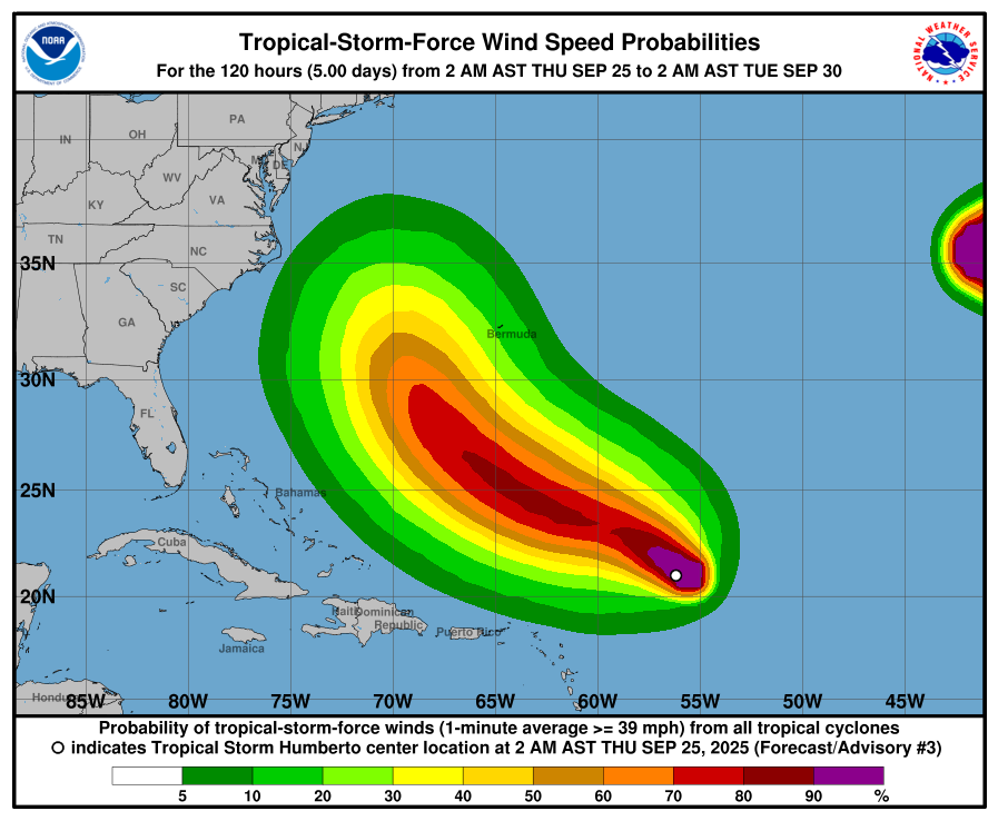 El organismo pronostica que Humberto se intensificará de manera gradual durante los próximos dos días, y la mayoría de los modelos indican que alcanzará la categoría de huracán durante el fin de semana, convirtiéndose en uno de mayor intensidad a comienzos de la próxima semana.