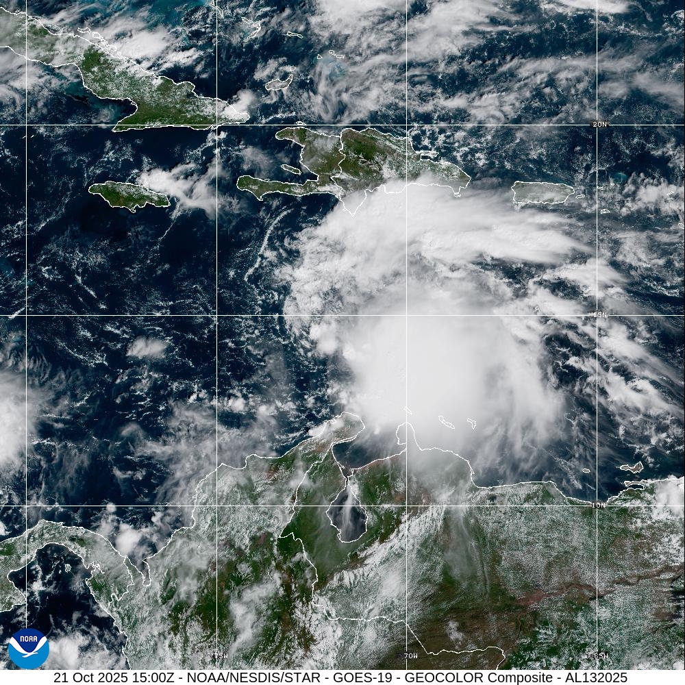Según el organismo meteorológico, el sistema se localiza en la latitud 14.3 N y longitud 71.7 O, a unos 480 kilómetros al sur de Puerto Príncipe, Haití, con vientos máximos sostenidos de 50 millas por hora (85 km/h) y una presión central mínima de 1003 milibares.