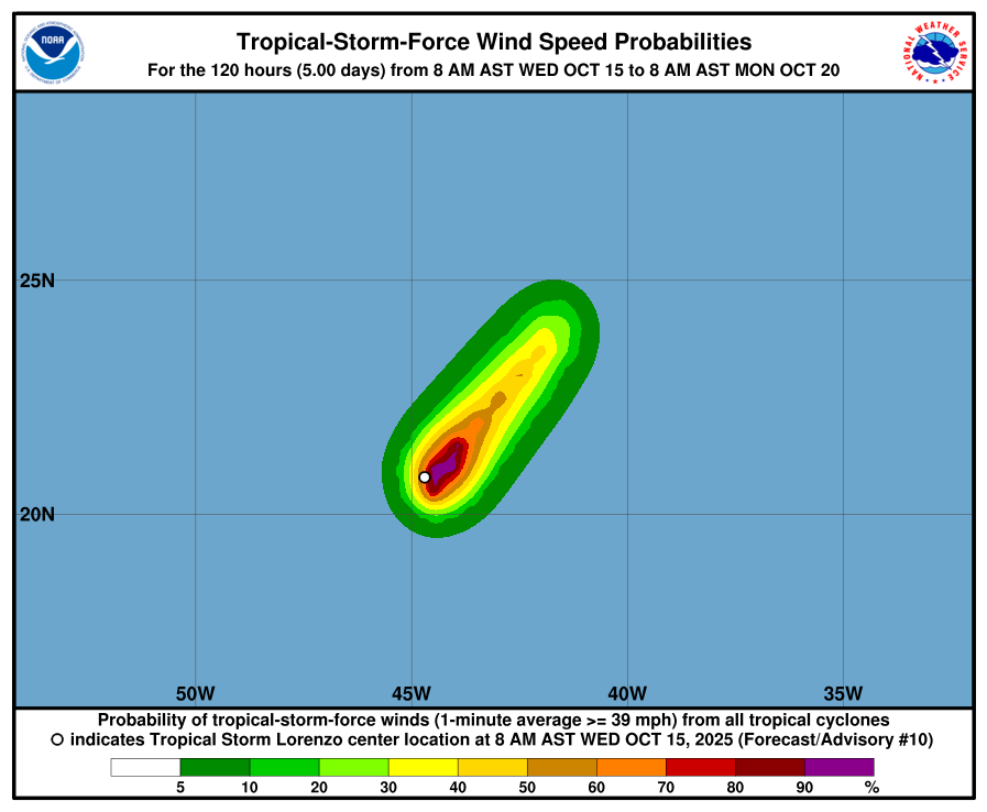 La tormenta tropical Lorenzo se desplaza sobre el Atlántico sin representar peligro para tierra firme y se espera que se debilite y desaparezca el jueves, informó este miércoles el Centro Nacional de Huracanes (NHC) de Estados Unidos.